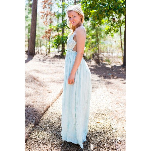 This maxi dress is a dress that is going to be remembered. Enbroidered lace front. Crinkled skirt. Choose from white, pink, or mint. Straps just on the sides of your arms with a low dipping back. Top runs small, and length runs long. If heavier chested, please order a size up, as the dress size is truly based on chest size in this particular dress. S=0-4, M=6-8, L=10-12.